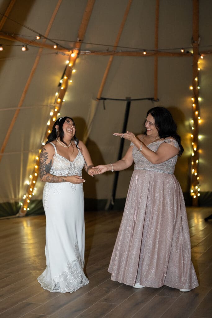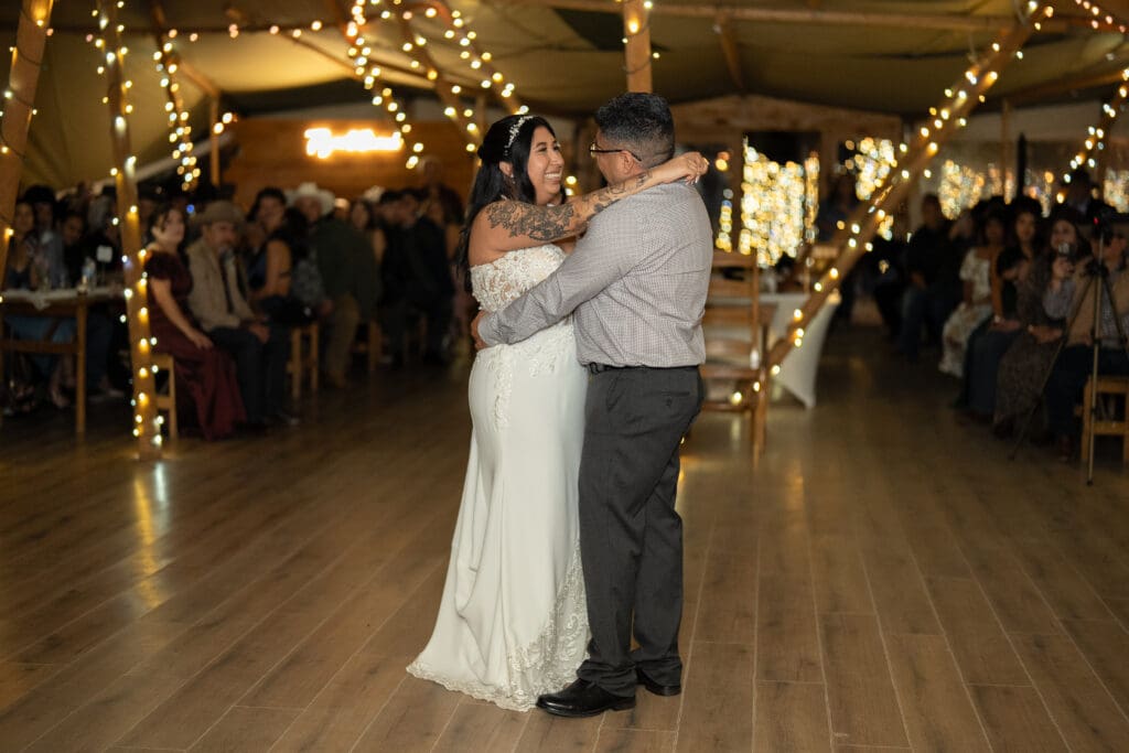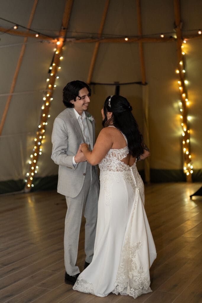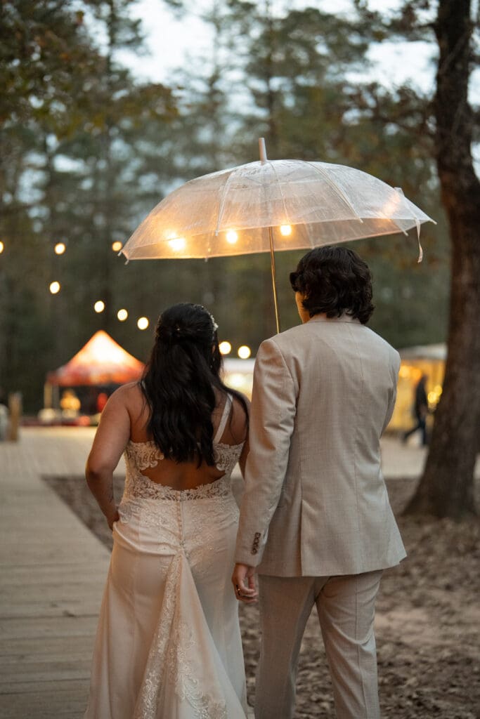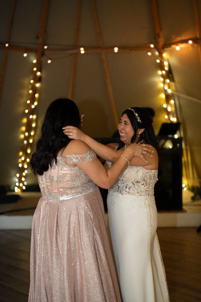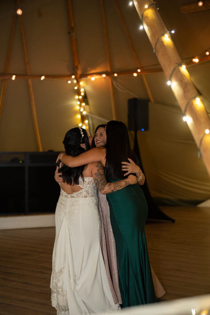 As the evening shifted into celebration, the rain began to fall. Instead of slowing the moment, it elevated it. They were announced, walked in to their closest people cheering, and danced together.